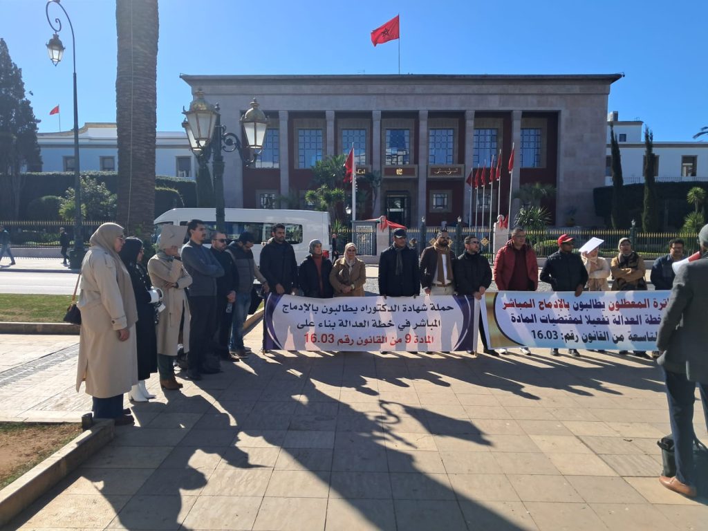 وقال عبد الغني التاغي، عضو التنسيقية الوطنية للدكاترة المطالبين بالإدماج المباشر في خطة العدالة، إن الوقفة تأتي في ظل تعنت الوزارة وتماطلها في الاستجابة لما يزيد عن ثلاثة سنوات من الانتظار بدون جدوى، مشيرا إلى قانونية المطلب بمقتضى المادة التاسعة من القانون المنظم للمهنة.
