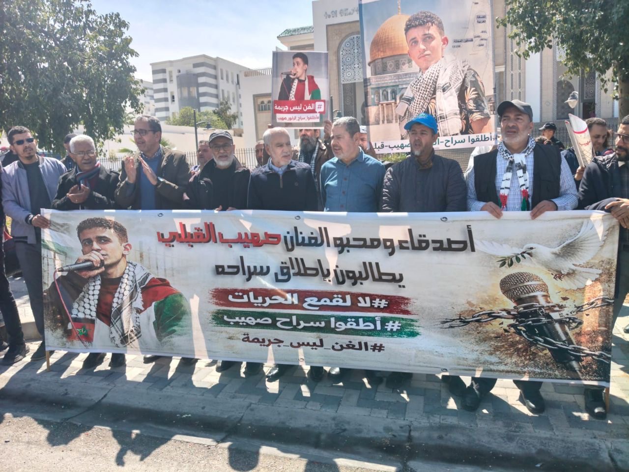 ونظم المتضامنون مع “الحاصل” وقفة احتجاجية تضامنية تزامنا مع انعقاد جلسة محاكمته، شارك فيها عدد من أفراد عائلته وأصدقائه ومحبيه، إلى جانب نشطاء وفعاليات حقوقية ومدنية، حيث رفع المحتجون شعارات ولافتات تطالب بالإفراج عنه، من بينها”أطلقوا سراح الفنان الشاب صهيب قبلي” و”الفن ليس جريمة”،معبرين عن تضامنهم معه ورفضهم لمتابعته بسبب تعبيرات فنية.
