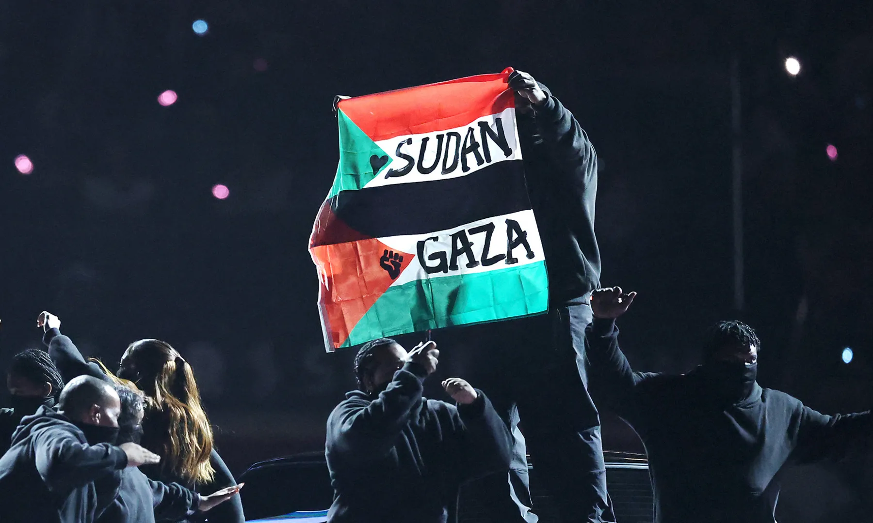 وخلال عرض مغني “الراب” الأمريكي”، كندريك لامار، في منتصف اللقاء، وقف أحد الراقصين فوق سيارة ورفع العلمين، وكان مكتوبا عليهما “السودان” و”غزة”.