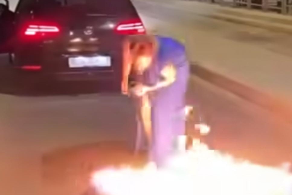 وبحسب ما وثقته الكاميرا، نزلت الشابة التي كانت ترتدي قميص سهرة أزرق من سيارتها، قبل أن تعمد إلى إشعال النيران في الرقم المكتوب على الأرض بمادة قابلة للاشتعال سوداء اللون.