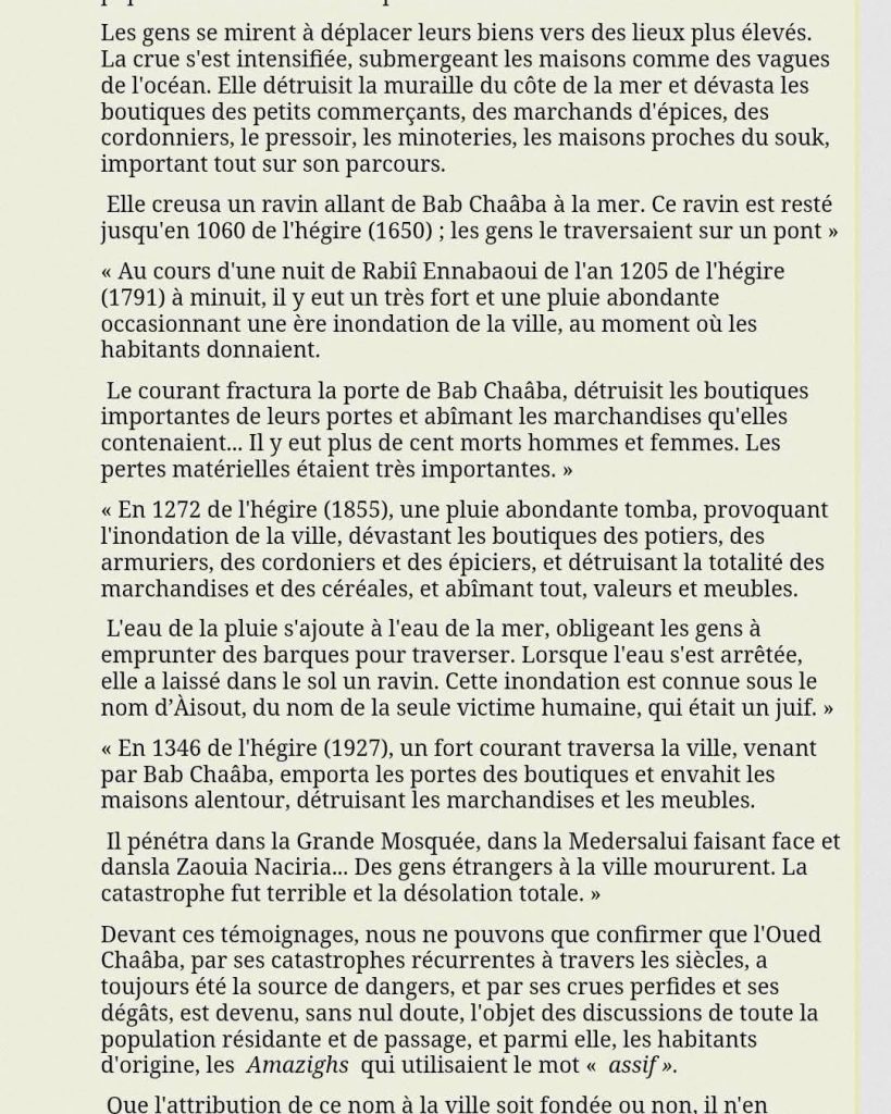 ويذكر الكنوني العبدي في رواياته أن فيضانا هائلا اجتاح المدينة، أغرق المنازل والمحلات وجرفت كل ما صادفته في طريقه.